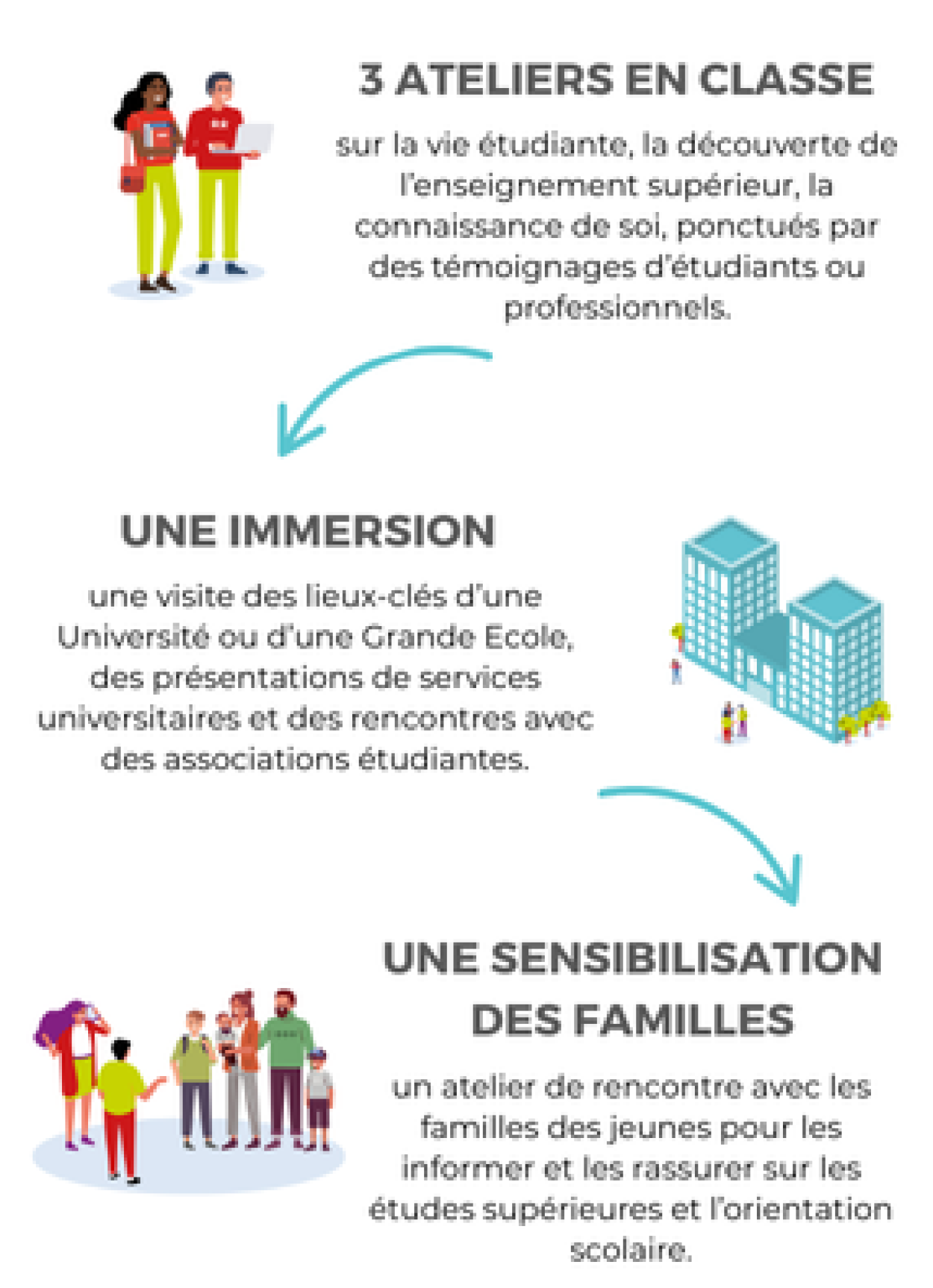 - Informer sur la diversité des parcours de formation, les jeunes et leurs familles, par de l’échange entre pairs et des immersions sur des campus